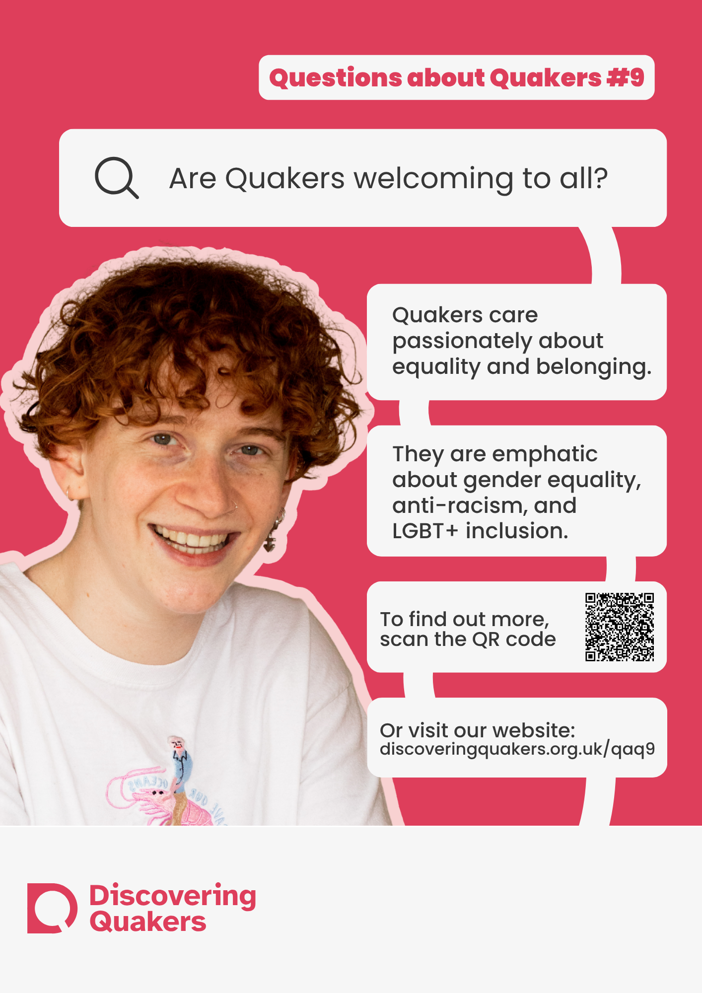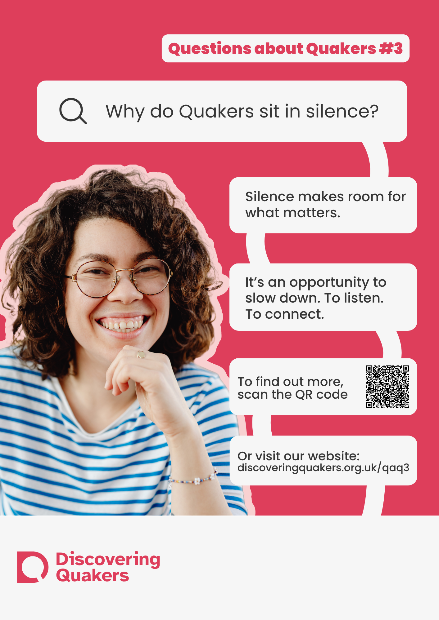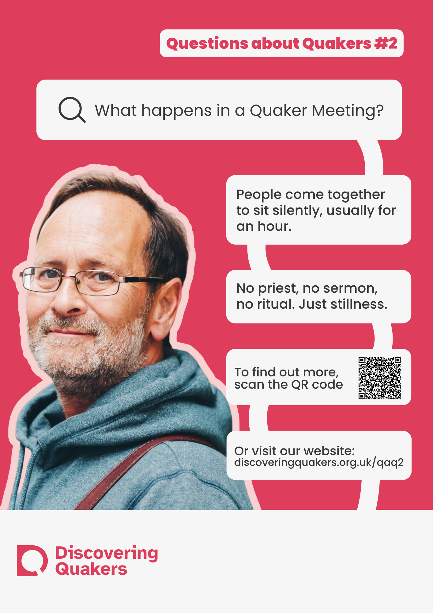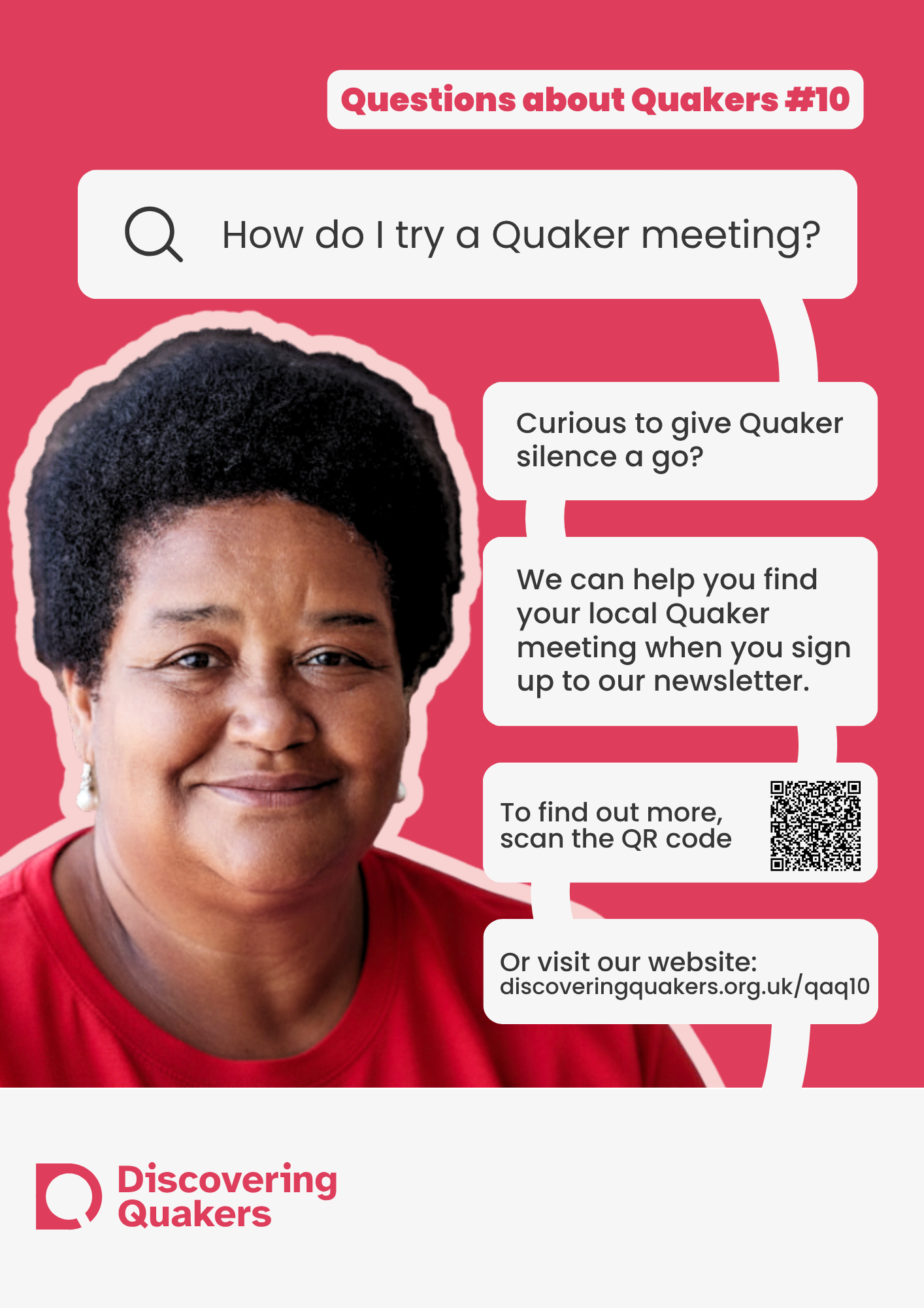 During 2026, Discovering Quakers is running an outreach campaign on the questions those with a new interest in Quakers ask. The campaign will be run online (social media, websites and newsletters) and through posters and leaflets for Meetings to use at their place of meeting and beyond. The campaign focuses on answering 10 of the most common questions asked asked by enquirers (images above). We are printing posters in sets of 10 - one poster for each question. We are able to offer each set of posters in three sizes; small (A5), medium (A4) and large (A3).