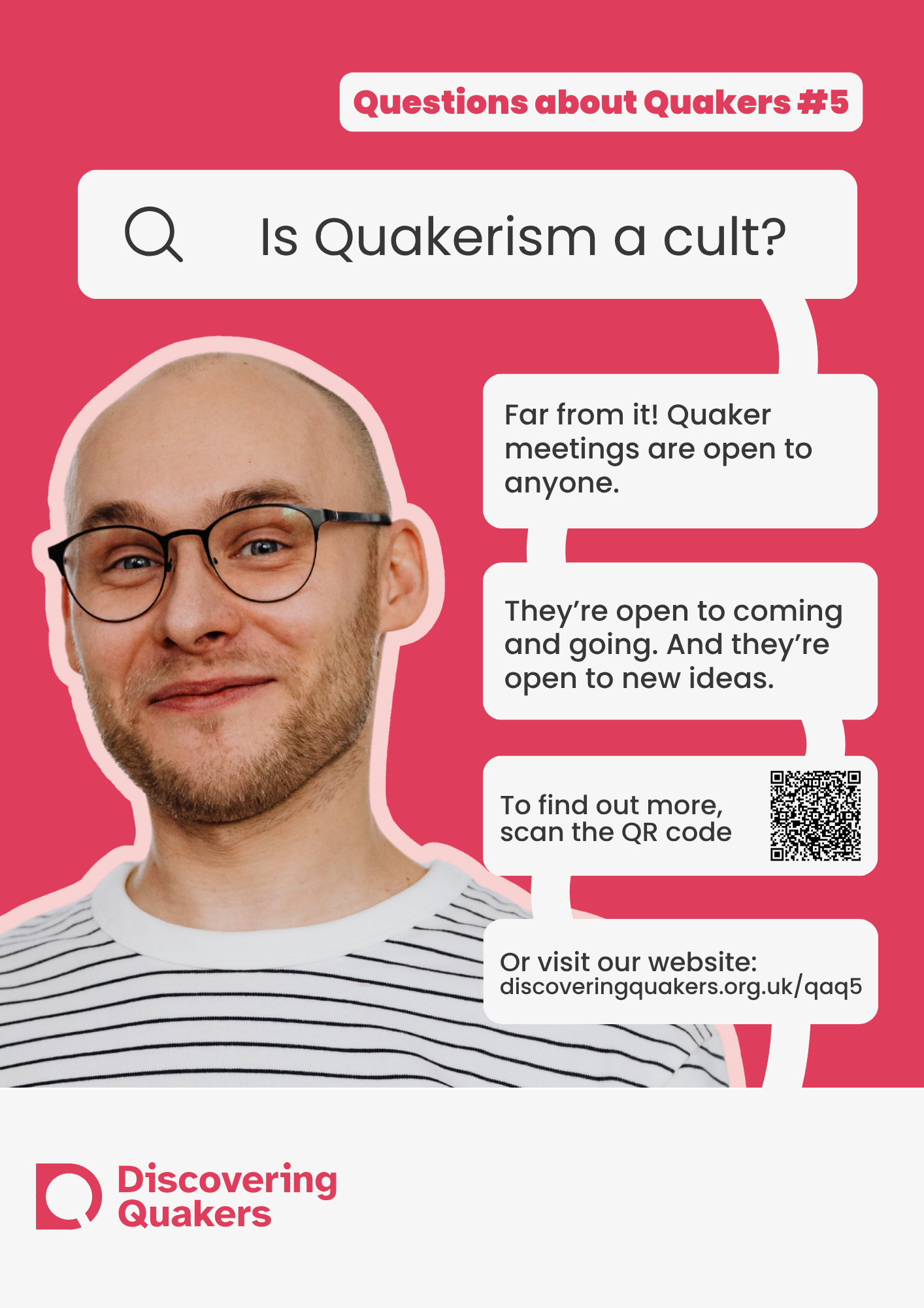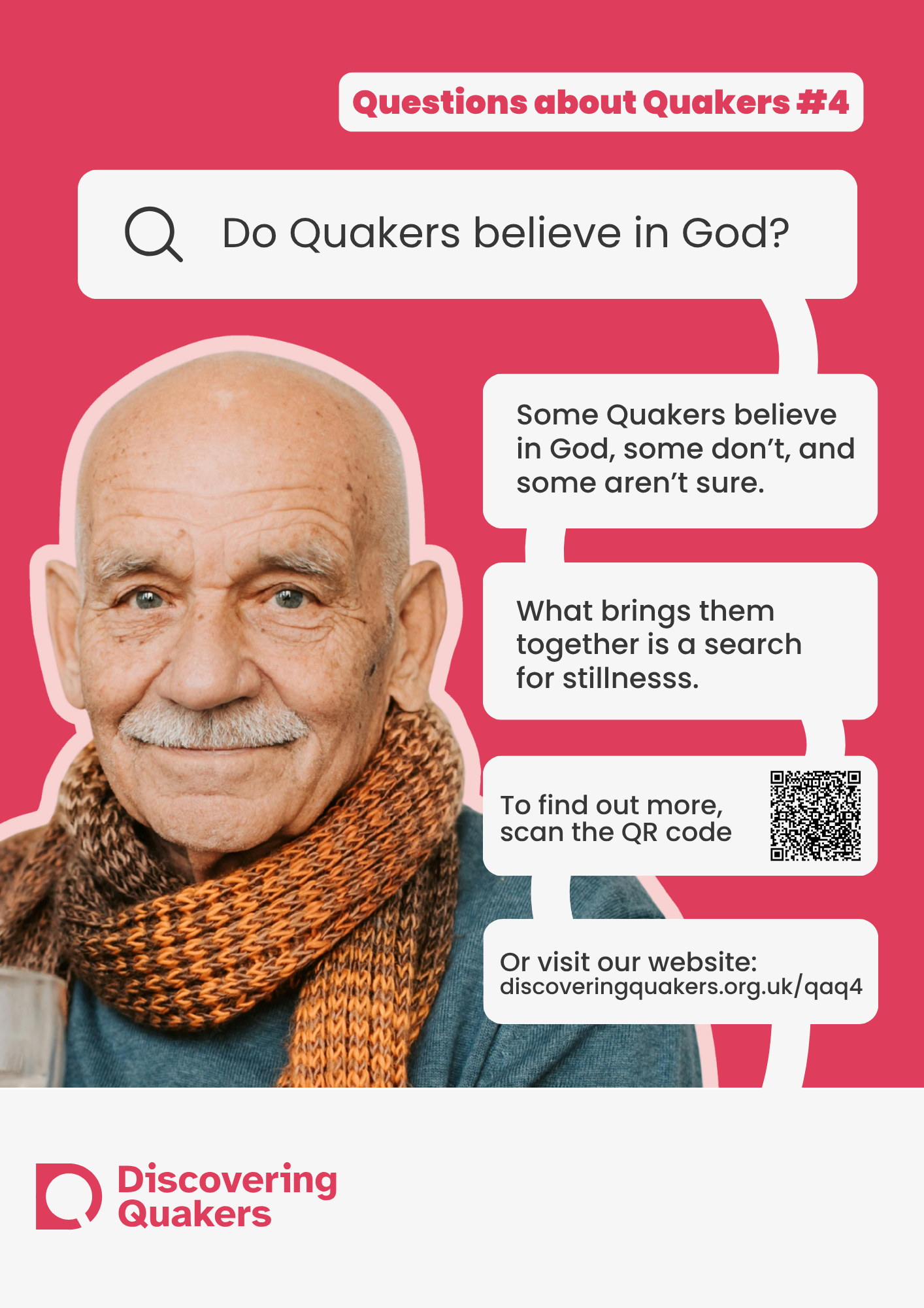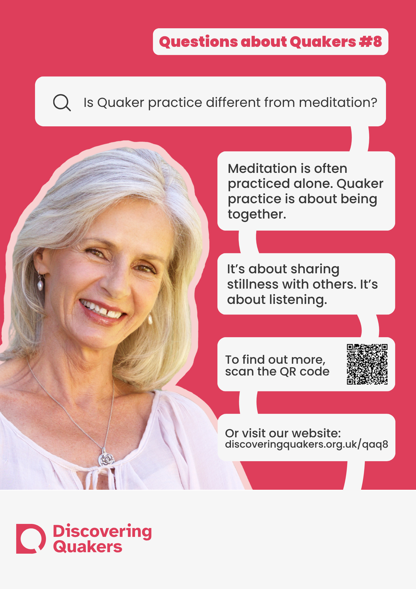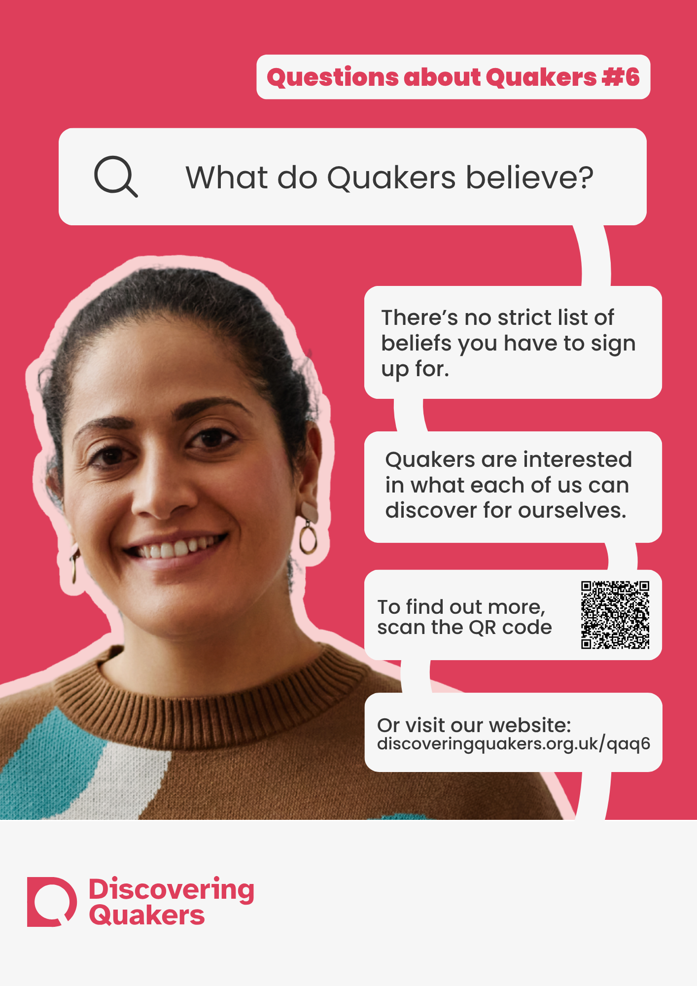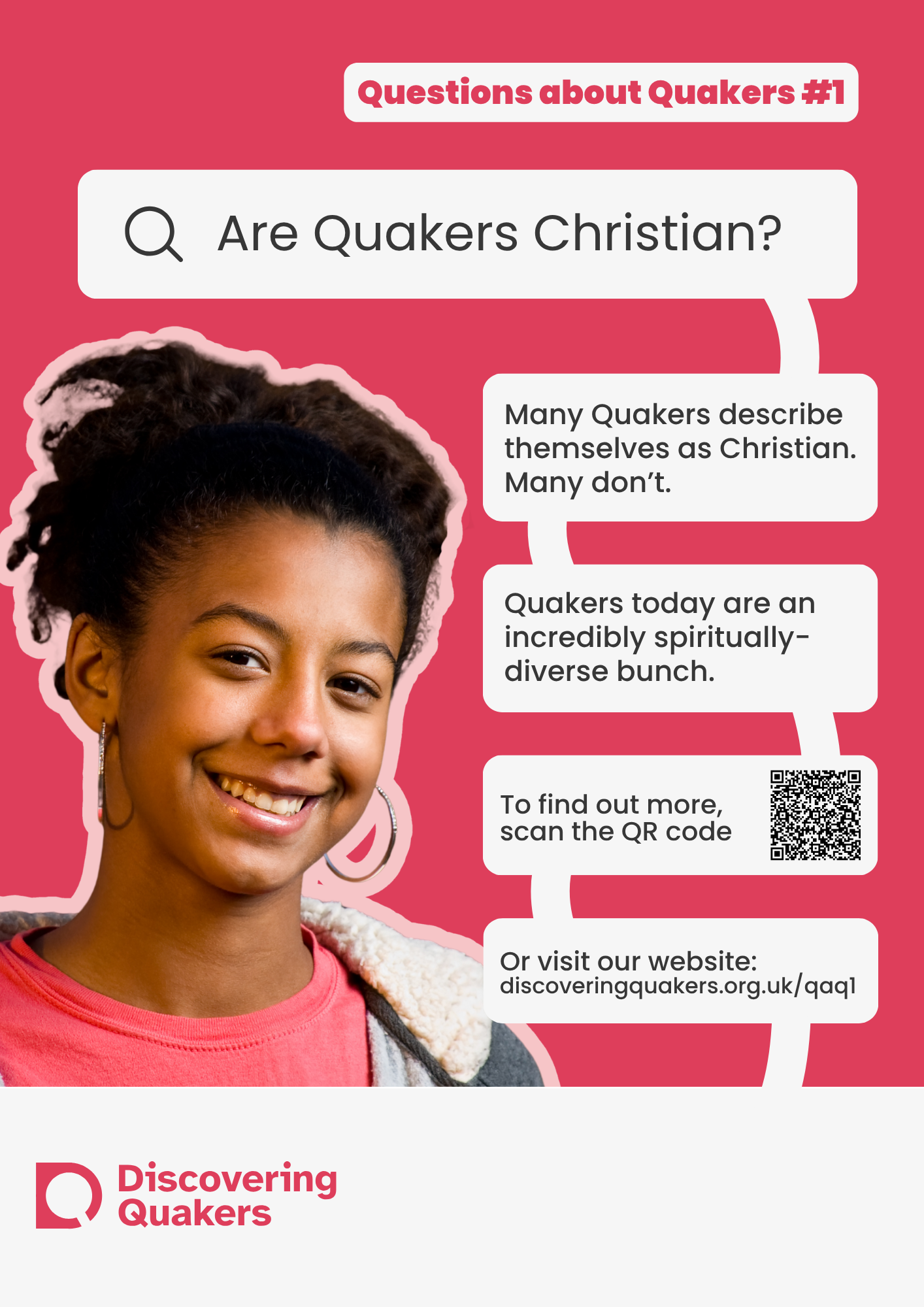During 2026, Discovering Quakers is running an outreach campaign on the questions those with a new interest in Quakers ask. The campaign will be run online (social media, websites and newsletters) and through posters and leaflets for Meetings to use at their place of meeting and beyond. The campaign focuses on answering 10 of the most common questions asked asked by enquirers (images above). We are printing posters in sets of 10 - one poster for each question. We are able to offer each set of posters in three sizes; small (A5), medium (A4) and large (A3).